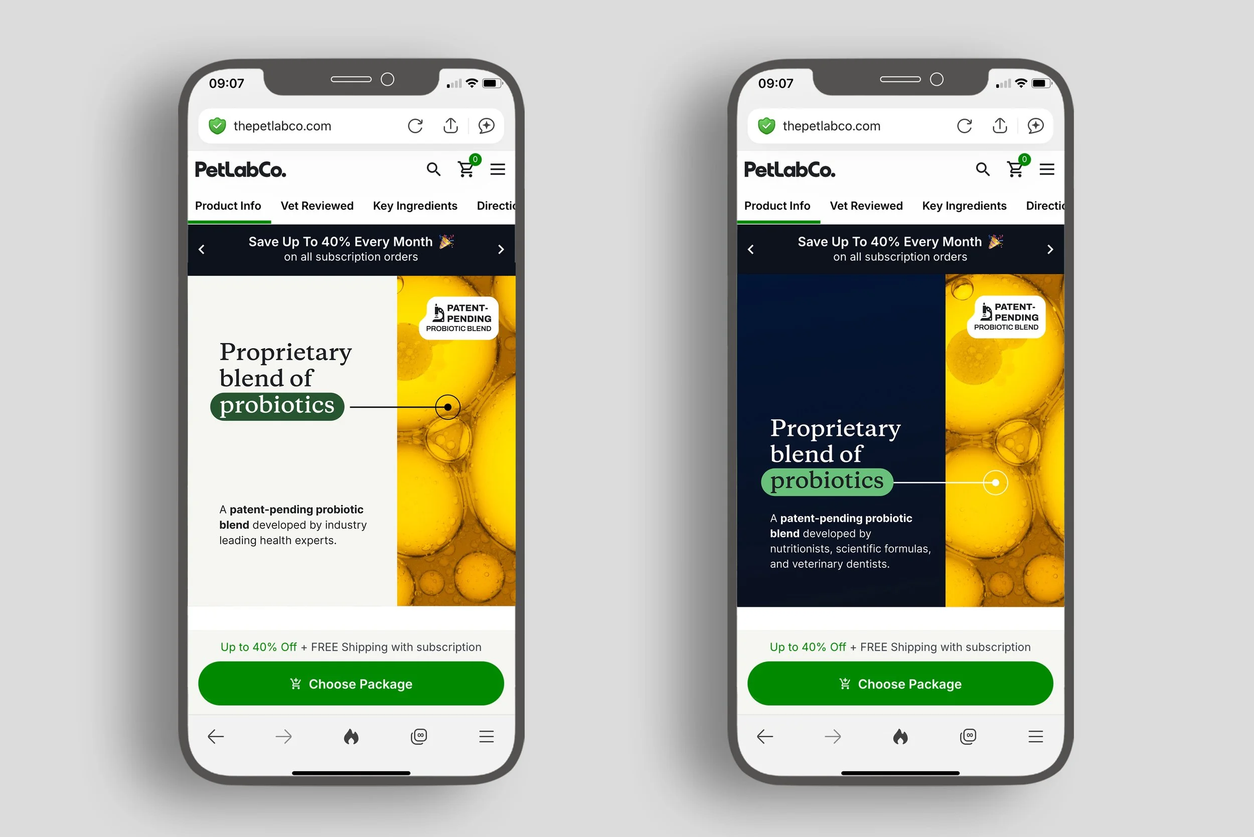 The previous carousel (left) next to the new re-branded carousel slide (right). The newer slide uses the same copy but draws more attention to the ingredient photography and textured feature of the product.